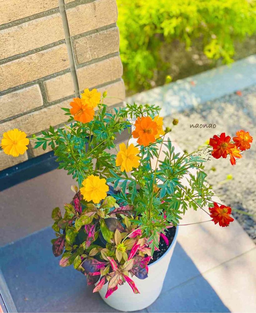 キバナコスモス、賑やかになってきました🌼黄色と赤に近いオレンジの2つを寄植えにしてましたが、咲いてくると、オレンジも混ざってグラデーションができました😃💛🧡❤️