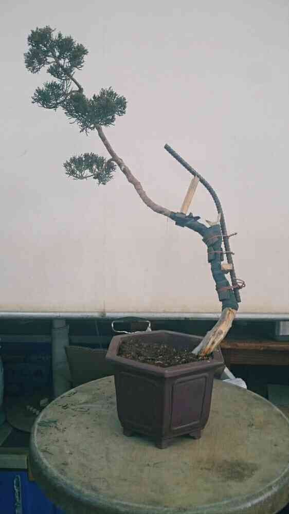 文人の真柏は立ち上がりが真っ直ぐで面白くないので一旦矯正。