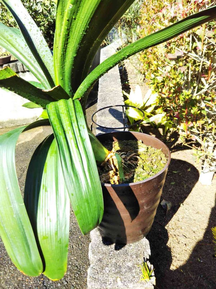 朝方はどしゃ降り雨☔️予報は晴れなのに😨前日は霰降り温度は一桁です🥶今やっと予報通りなり晴れてきました。冬支度二回目、屋根の下日影に置いてる「クンシラン・君子蘭」陽なたに出します。株分けして譲り受け10年になります🙇用土は土から👴軽い水苔変更して四年目?😂初めて子株出てきました❗️👀☀️陽なたぼっこ🦗バッタも😃陽射しで体を温めてます☺️寒い前日から良くぞ生きてましたね🎵