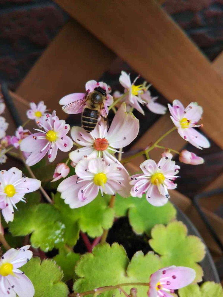 晴れ☀️てきて暖かくなりました、駐車場の大文字草「桃麗」に🐝蜜蜂😄いっぱい飲んで下さい😃