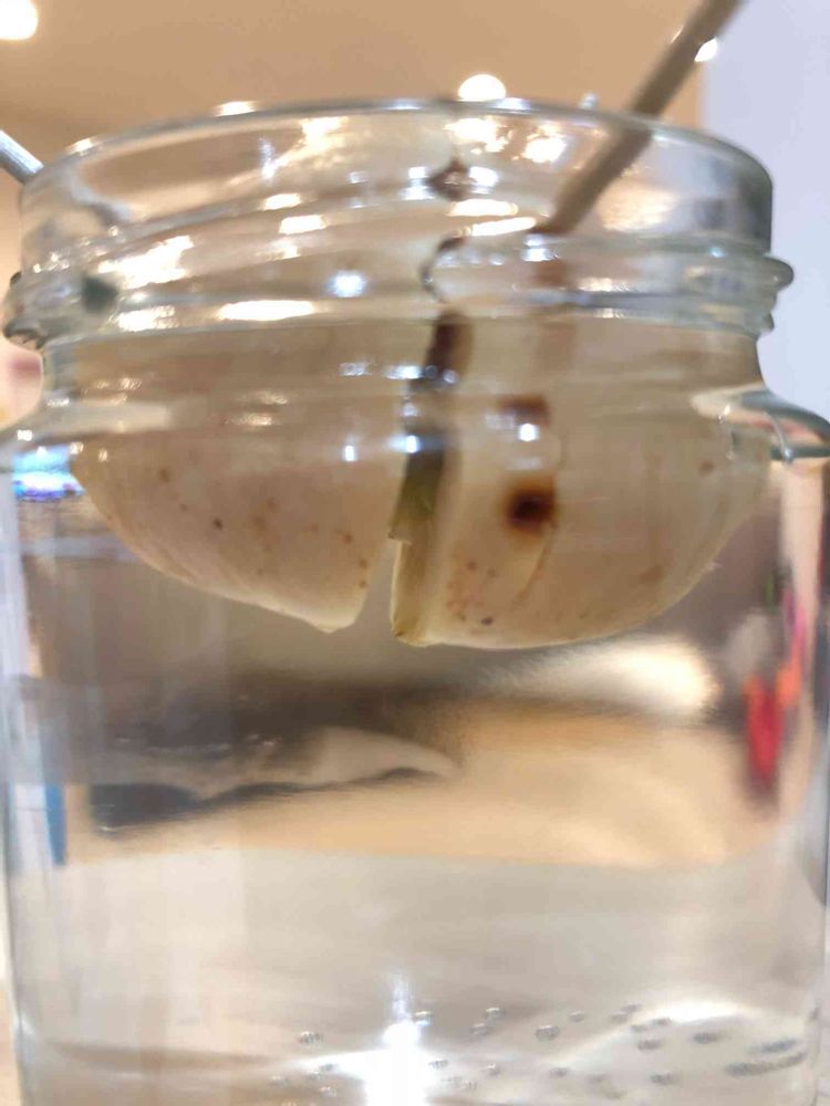 アボカドの根っこが出そうだけど、その前にタネが真っ二つに割れそう…