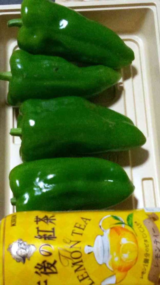 私もつい先日、庭でなったからとピーマン10個くらいもらったんですが…こーんなにBIGではなかったです。