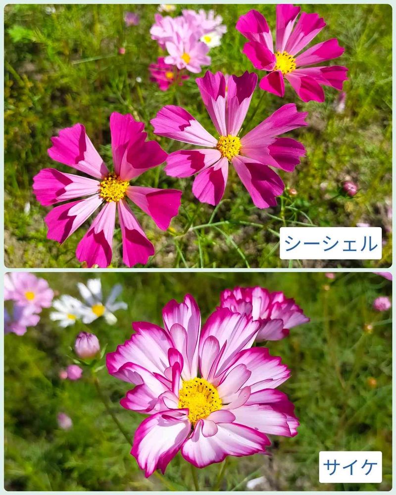 筒咲き品種の[シーシェル]と複弁の混合種、半八重咲きの[サイケ]