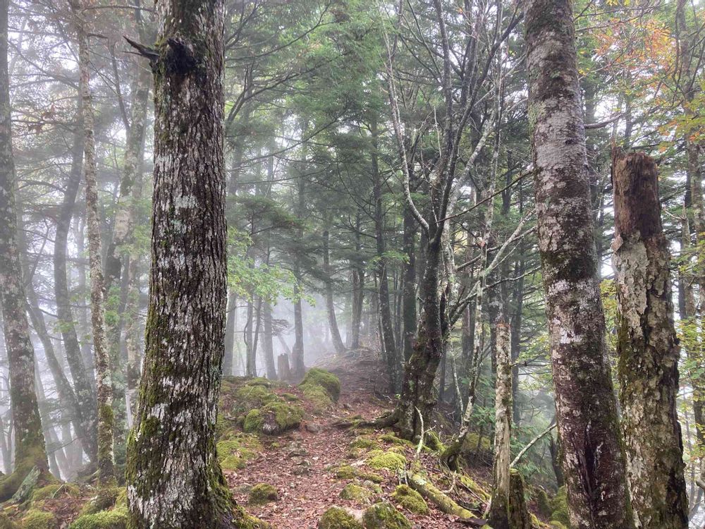 肌寒いのガスった登山道、静かな世界が広がります。 喘ぎながら登って来て、小休止。