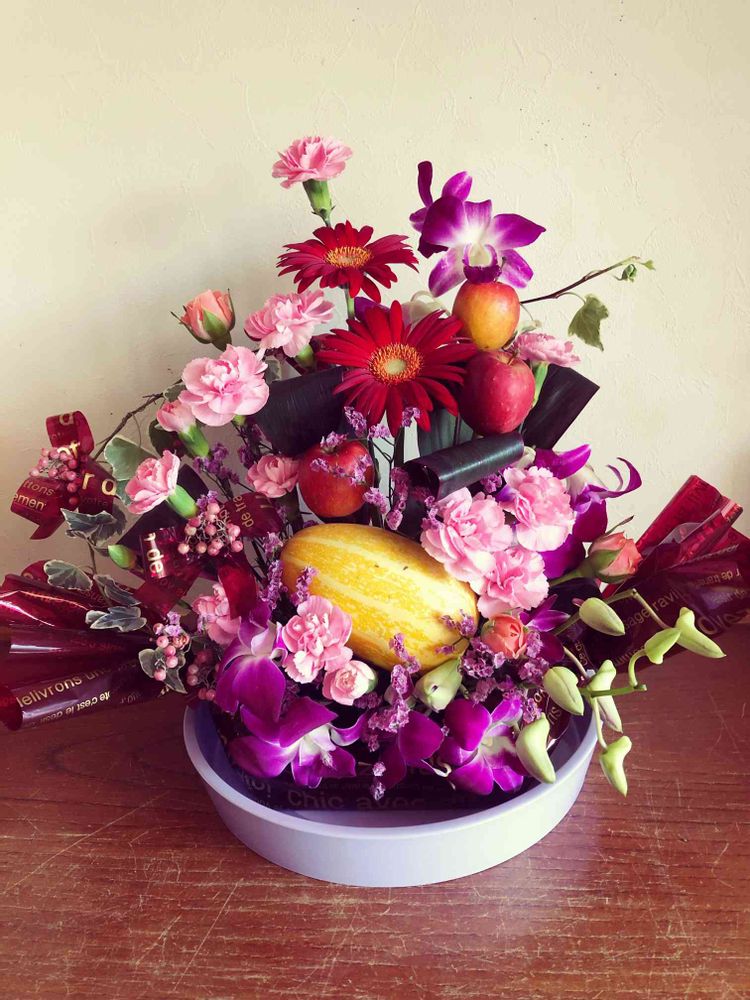 ハロウィン🎃のフラワーアレンジメント。キャンディに見立てた包装紙の中に、お花やオモチャかぼちゃ、姫リンゴを飾ります。