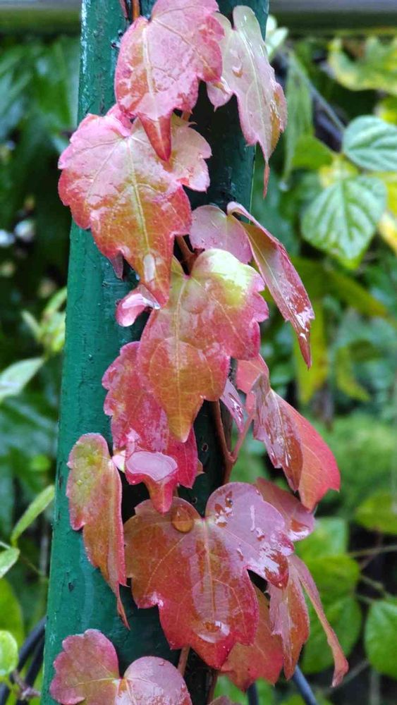 物干し台の支柱に絡まって赤く色付いてる蔦の葉っぱ🍁💜❤️💜