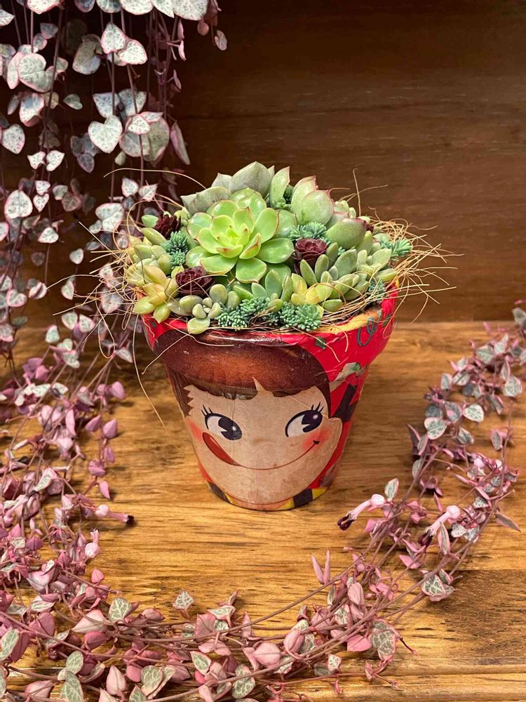 6月のペコちゃん祭りにミルキーの袋をデコパージュ(?)して作ったしわしわリメ鉢❣️