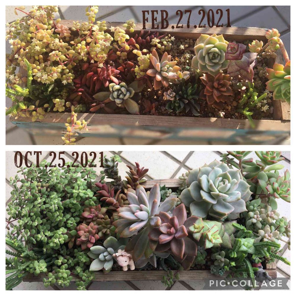 多肉ちゃん、比べるとすごい変化だね💚青々と元気で⤴️これならまた紅葉していくんだね😍