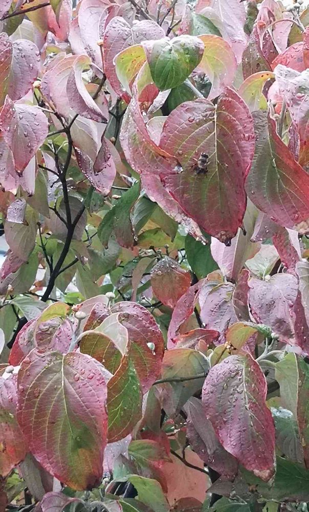 雨天の中、紅葉したハナミズキの葉の上で🐝が休んでおりました。雨が上がって翅が乾いたら、活動開始かな?