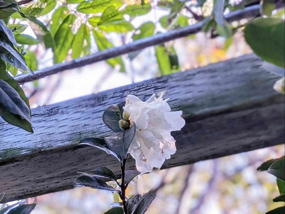 最初の白い山茶花…藤棚の下の天辺で咲いていました。…気付かなかった〜。