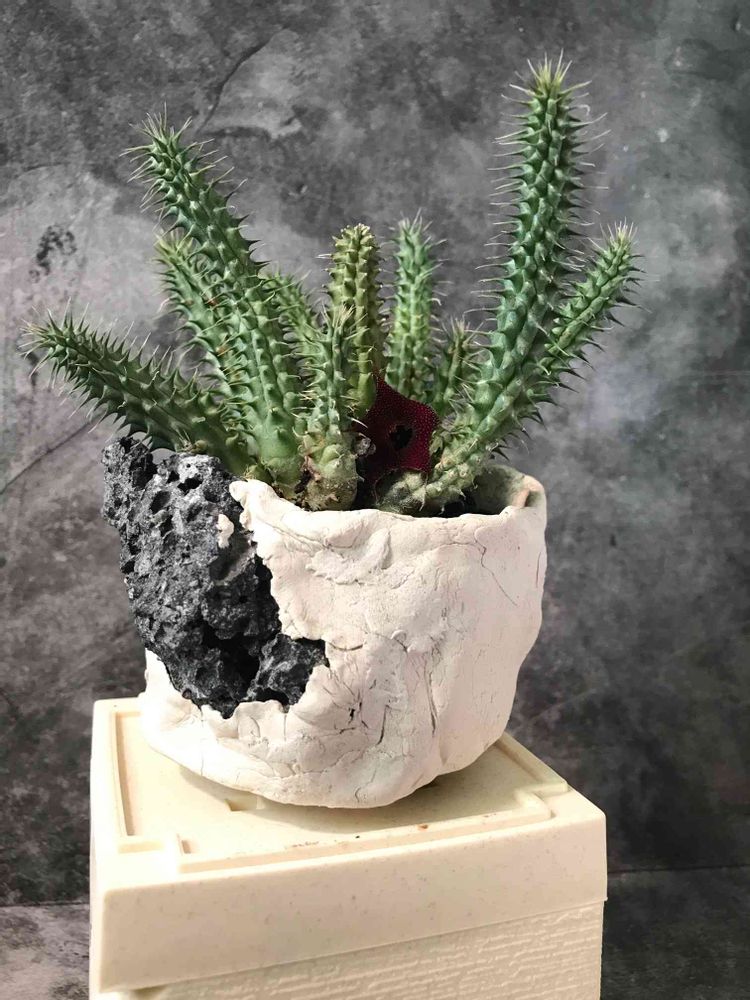 富士溶岩貼り付け自作鉢に植え替えました。陶土は『ひなたぼっこ』。