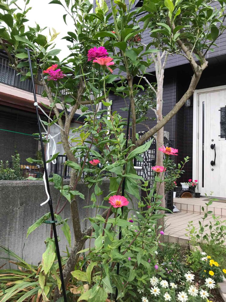 今年はレモン🍋 .*゜が ひとつも出来なかったので 寂しいなぁ…と思っていたらこのジニアさんどんどん伸びて レモンの木の中で咲いています(*≧艸≦)
