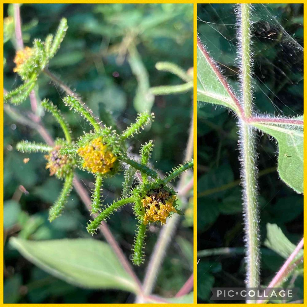メナモミ初めましてです。黄色い頭花の周りでヒトデのように開いてるのは、五個の総苞片。腺毛が密生していてイボイボに見えます。茎の腺毛もかなり濃いです。コメナモミは激似らしいですが茎の毛が薄いそうです。茎を撮影しておいてよかった〜