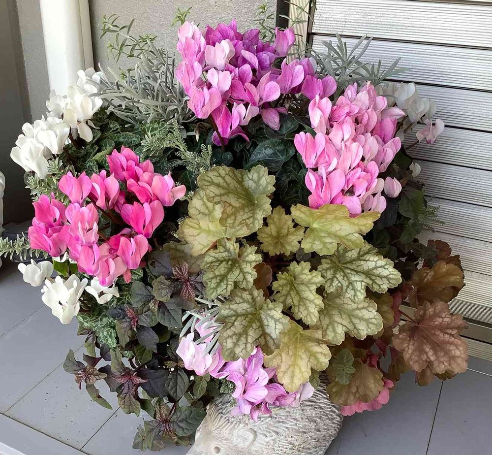 シクラメンとヒューケラなどのリーフでのハンギングバスケットを作りました。