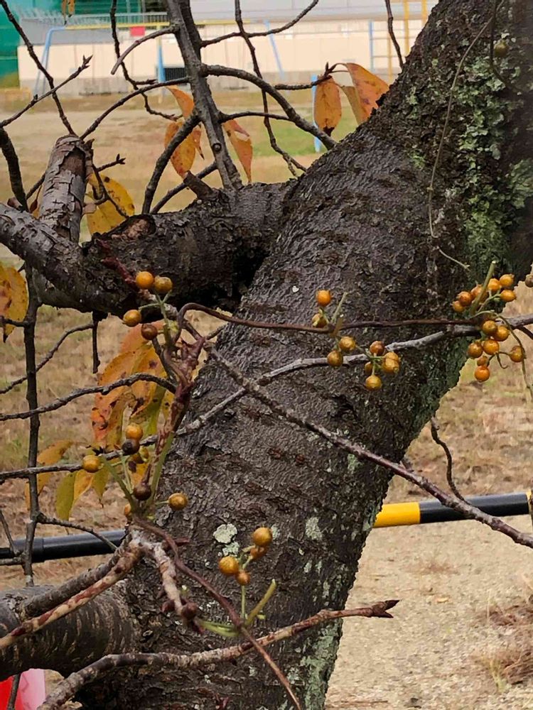 学校の校庭のソメイヨシノの木にヘクソカズラの果実が絡まっていて紅葉した葉と同じような色をしていました