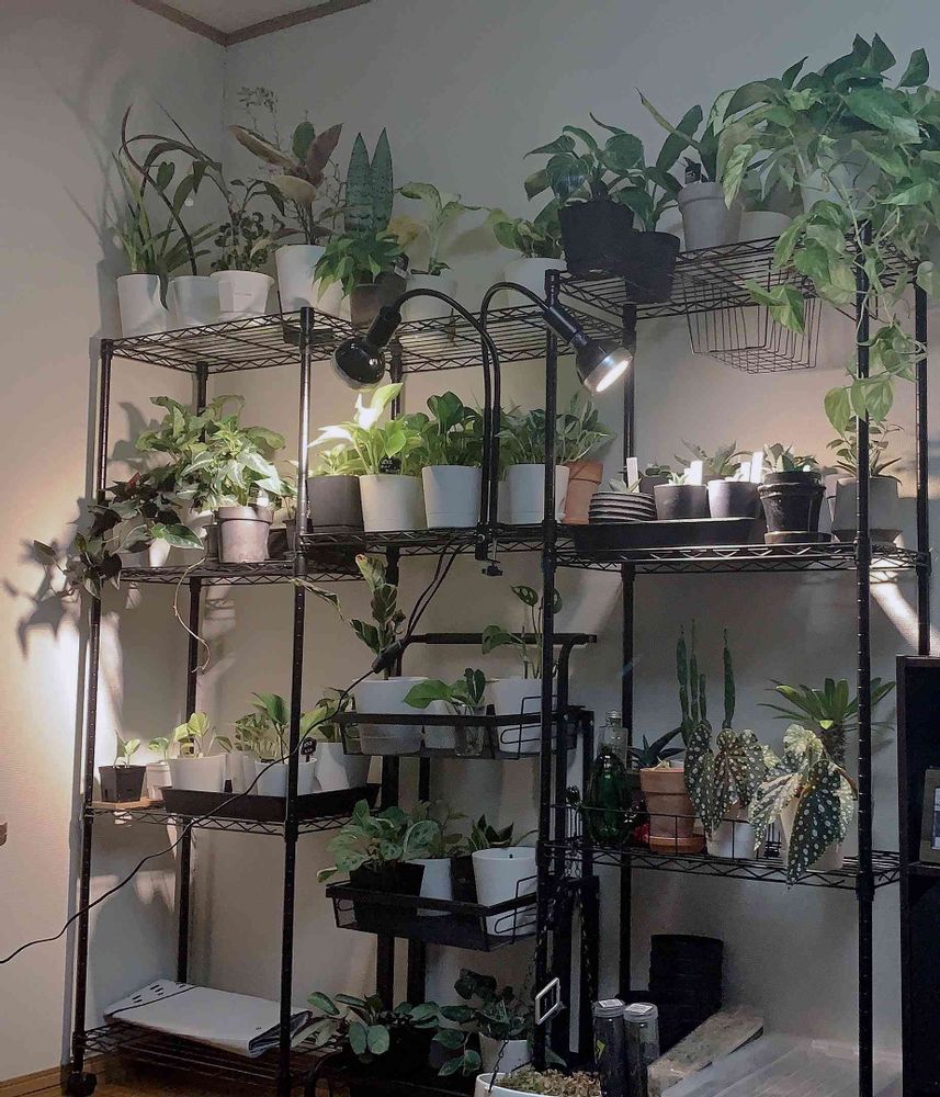 急な寒さに耐えられなくて葉っぱが黄色くなっちゃった子いるけど、何とかラックを組み立てて半分部屋の角に移動しました(*^^*)育成ライトひとつじゃ足りなくてもう一個買おうか悩み中🙄