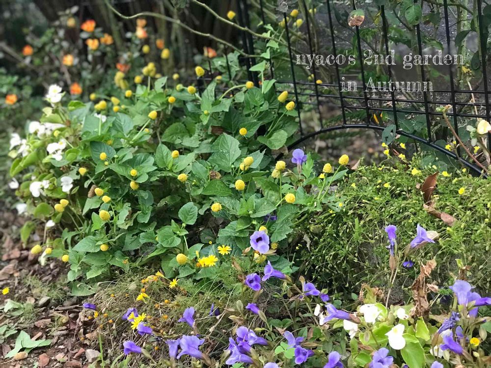 手前のメカルドニアはフェンスを固定するために置いてるコンクリートブロックの穴に植え込んでるの🌼