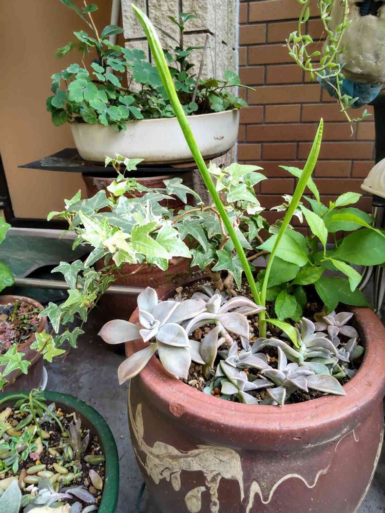 ニンニクってお水あんまりあげなくていいし、上に多肉植えたら場所取らなくていいですね😊