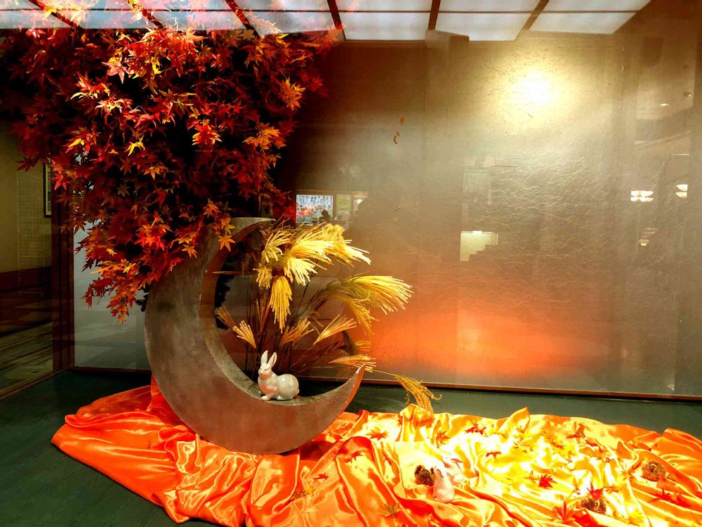 花器がお月様、ウサギさんが居て、水面に映った月の光を表現したような敷物の敷き方👀‼️