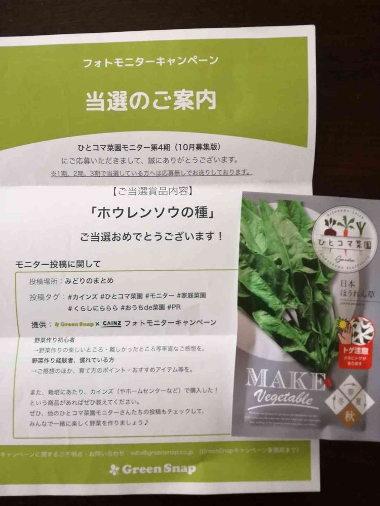 ひとコマ菜園でほうれん草のタネいただきました💕グリーンスナップさん、カインズさんありがとうございます✨とはいえ、こちら高山市、だんだん寒いんですけど、今から植えて果たしてちゃんと育ってくれるかな⁉️とにかく挑戦!やってみよ🎵