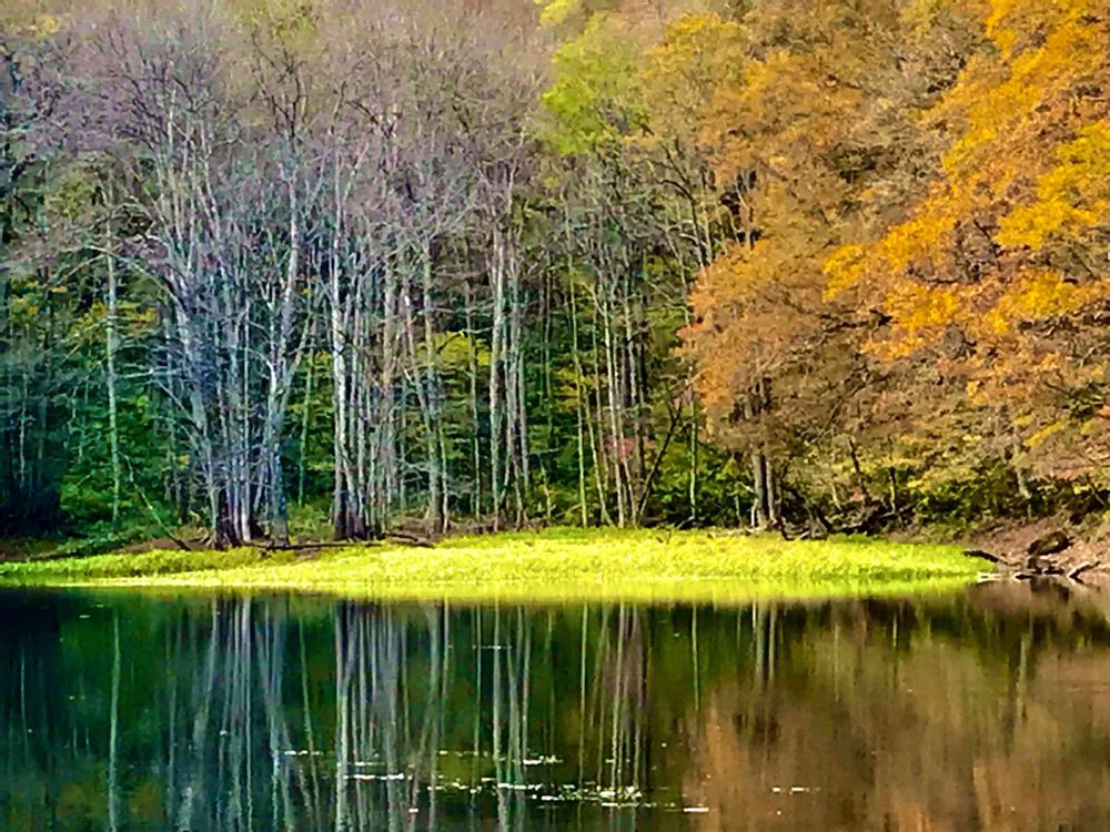 良いですねぇ‼️紅葉した林、葉を落としてまっすぐ白く並ぶ木々、黄緑の草、水に映る姿の美しさ、素晴らしいです。