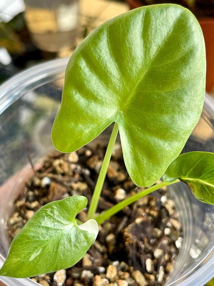白が少なめの斑入りクワズイモから緑のみの葉が出てました😢
