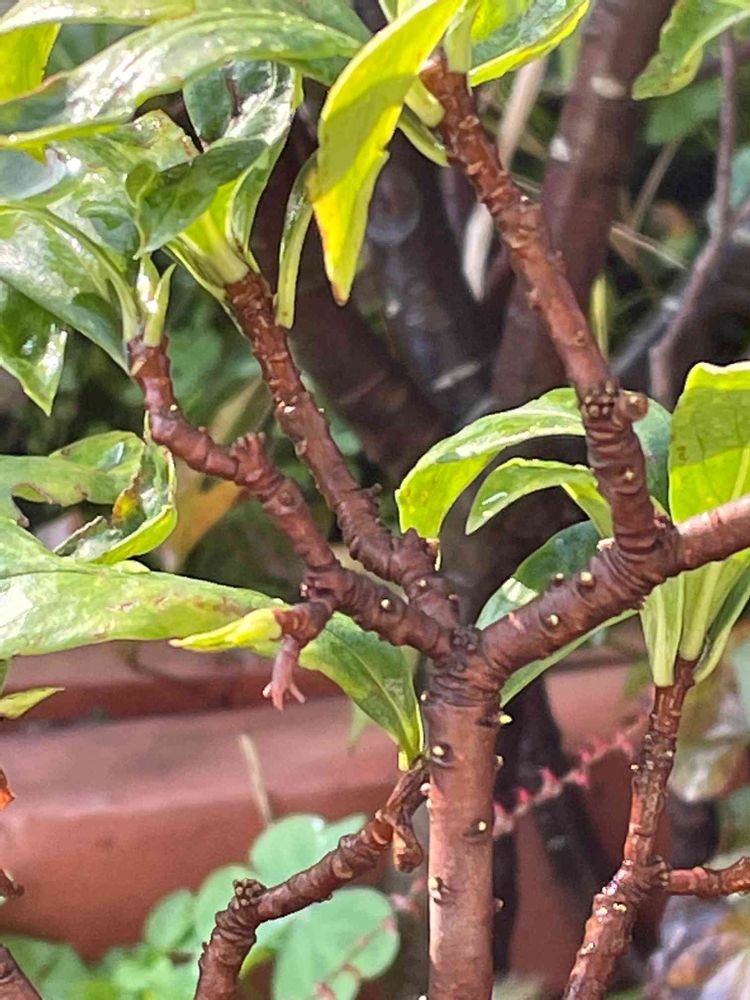令和3年10月28日(木)晴れ☀️ おはよー^_^ ございます 小さい庭で朝の見廻りしています。 台風の影響で陽が昇るまで雨が落ちていたみたい🙂階段横の沈丁花が濡れています😳新芽🌱✨かな?小さい緑色