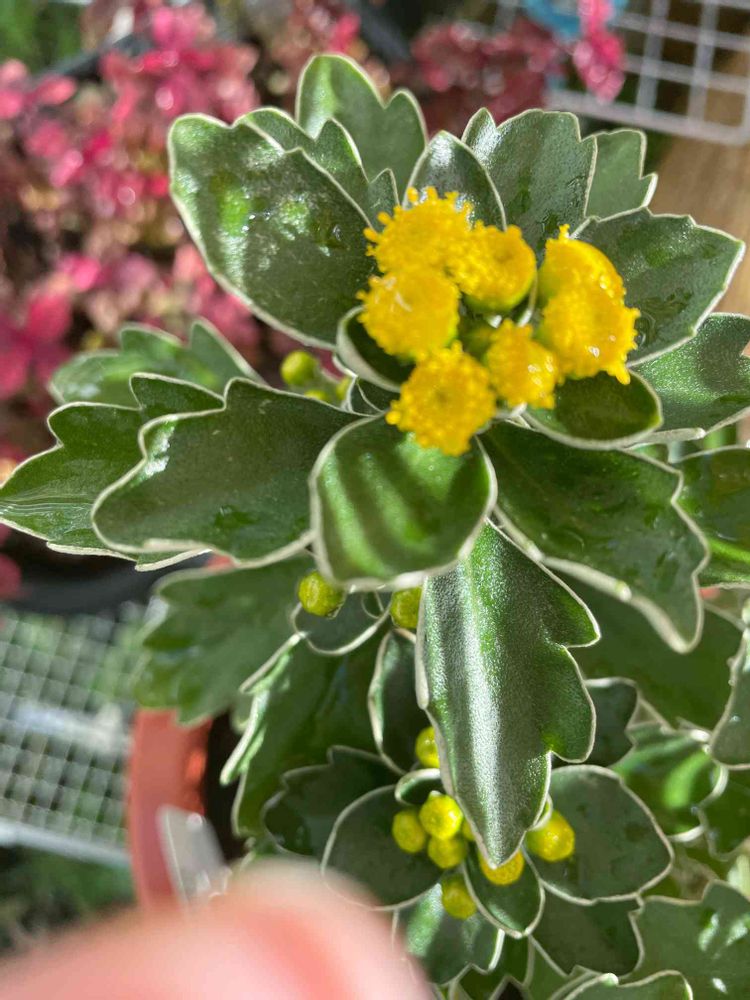 2021ー10ー28(木)晴れ☀️ つぶつぶの日イソギクで参加させて頂いていいですか〜? 花未だ🌼開ききらない🤔シロタエギクより花弁短いのか〜 葉っぱも花もスプレーマムより強いみたいですね セザンヌ枯れちゃいました。