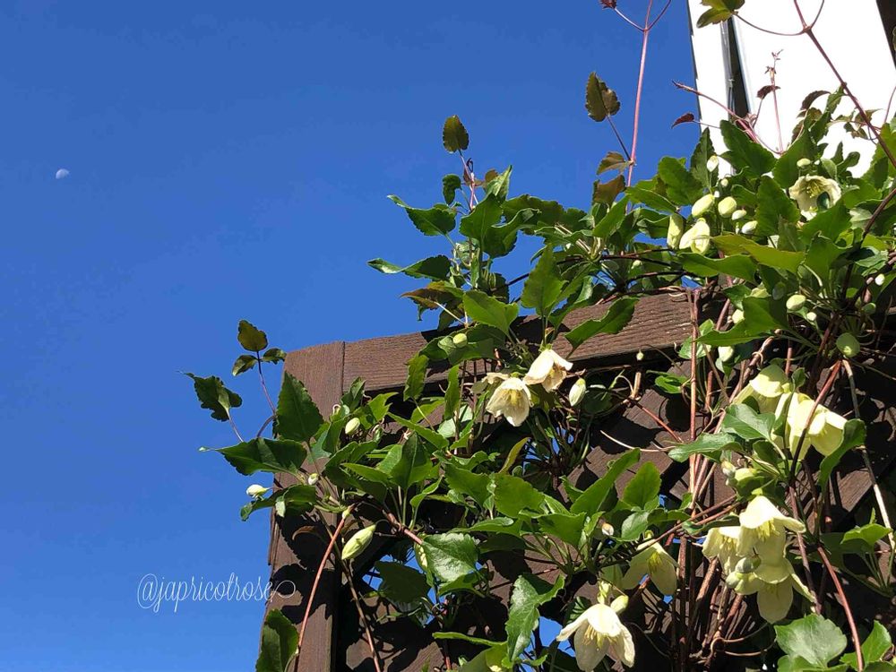 青い空にまだお月さんがいて、たくさん咲いたクレマチス・シルホサ・ジングルベルと共演してます✨