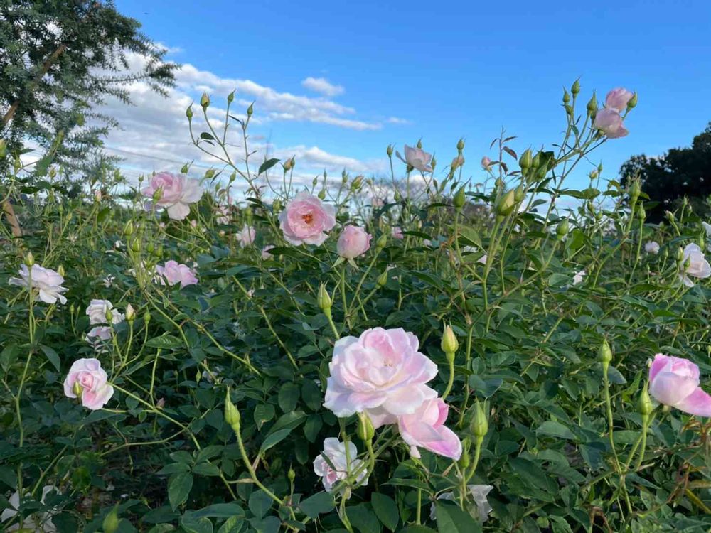 優しい色の薔薇が青空に輝いて綺麗ですね🌹💓💕