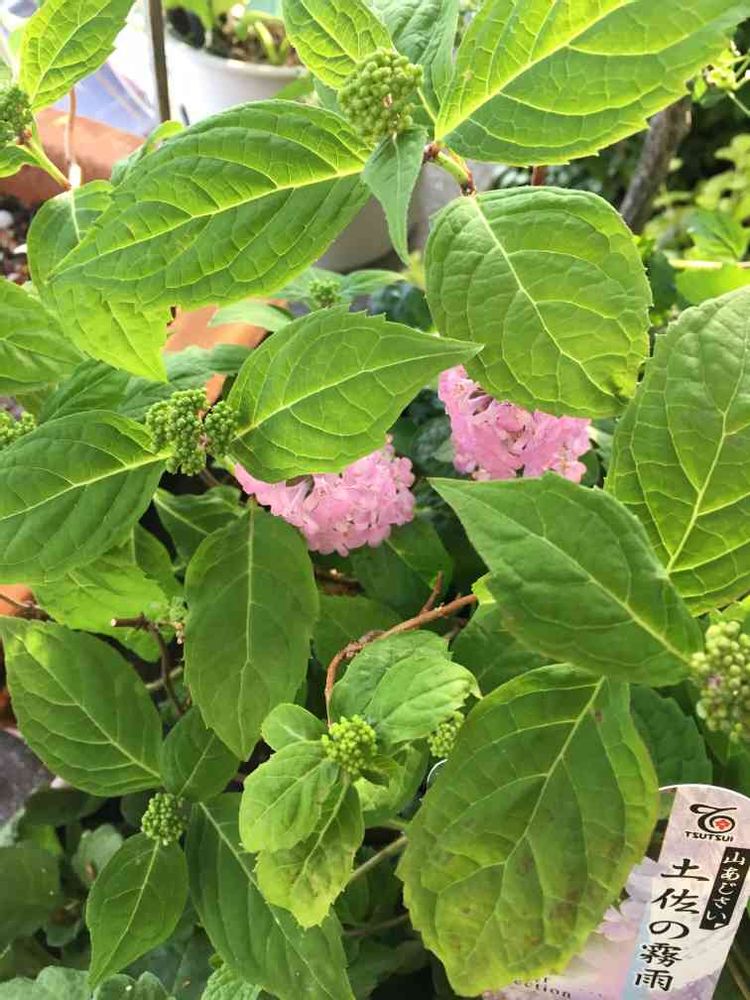 山あじさい「土佐の霧雨」は開花して、5月27日に部屋の中で写真撮って投稿したので 雰囲気が違うと思いますよ〜(๑′ᴗ‵๑)こげ茶色の壁の前で。