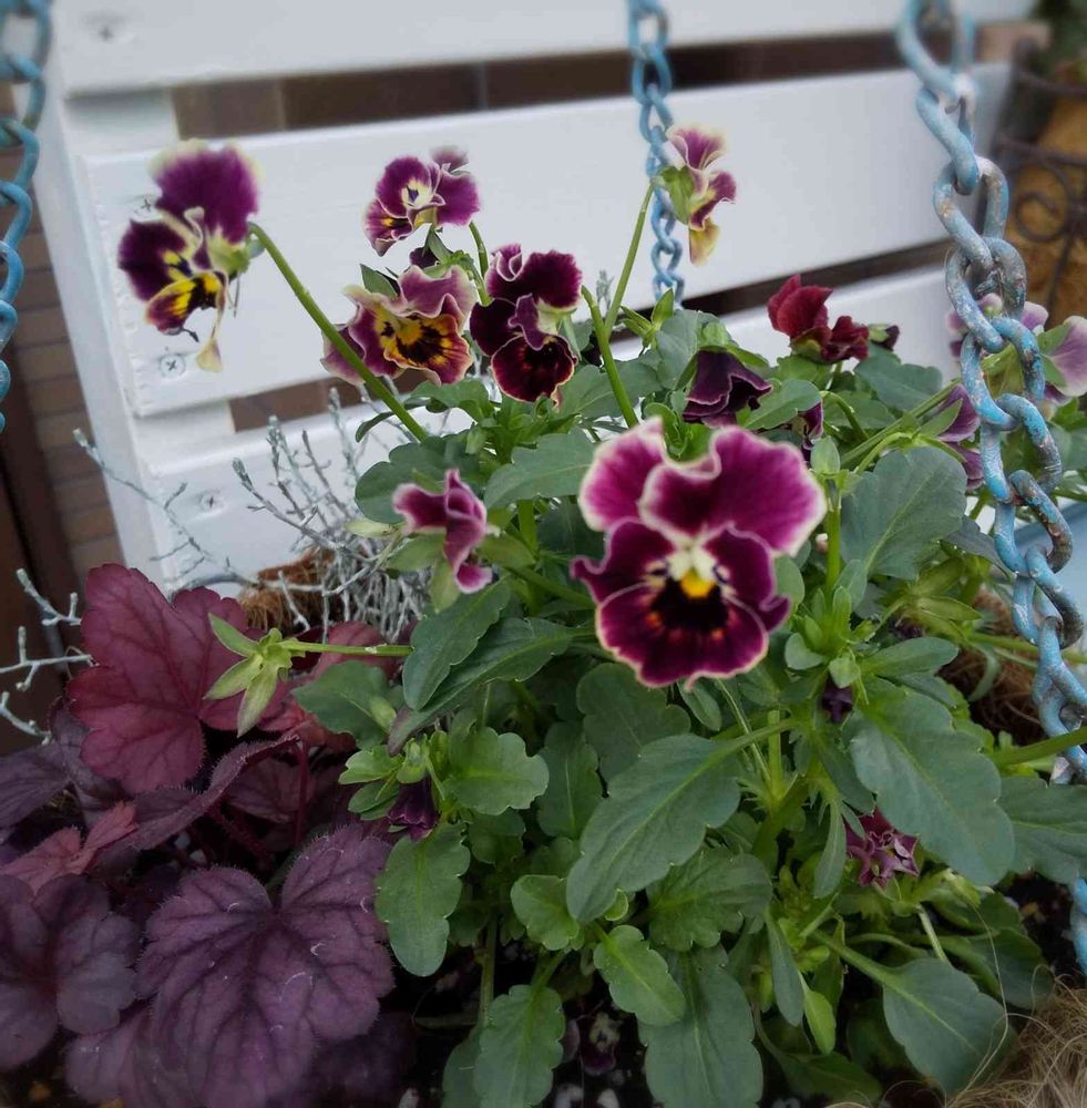 ビオラ ミルフルとプラチーナ、ヒューケラグレープソーダ🍇の寄せ植えです💗