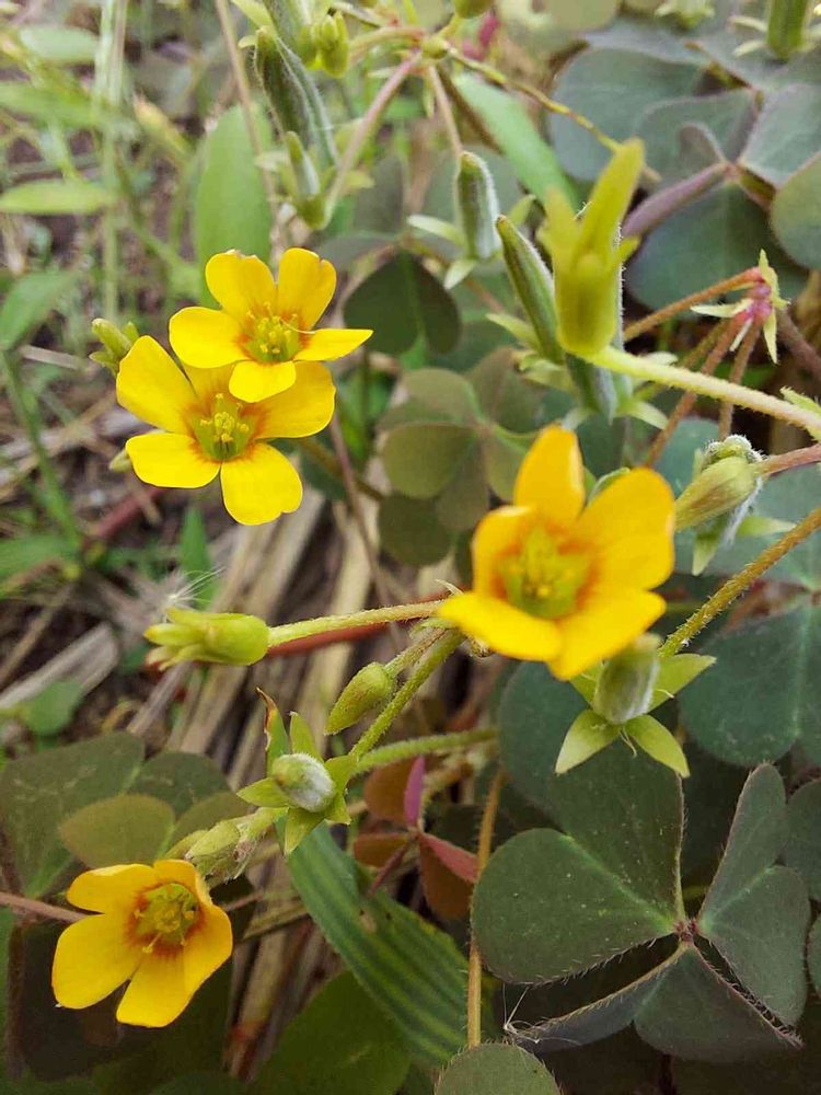 雑然とした畑に咲いている濃い黄色の可愛いお花💛今日のお花オキザリスに似ているオッタチカタバミ❓😅
