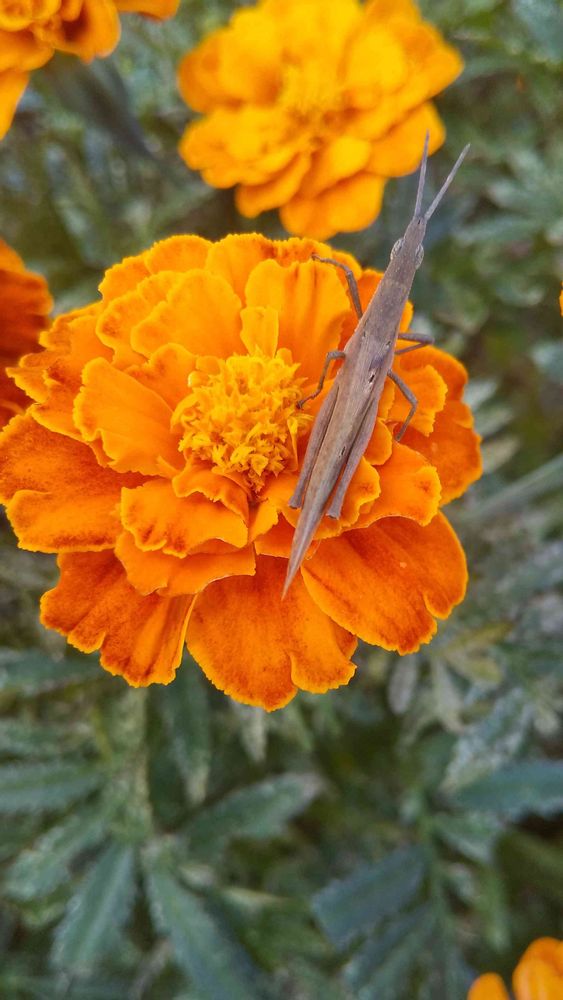 「マリーゴールド」に茶色いバッタさんも来ました。🏵️🦗🌿🤗😄🌞