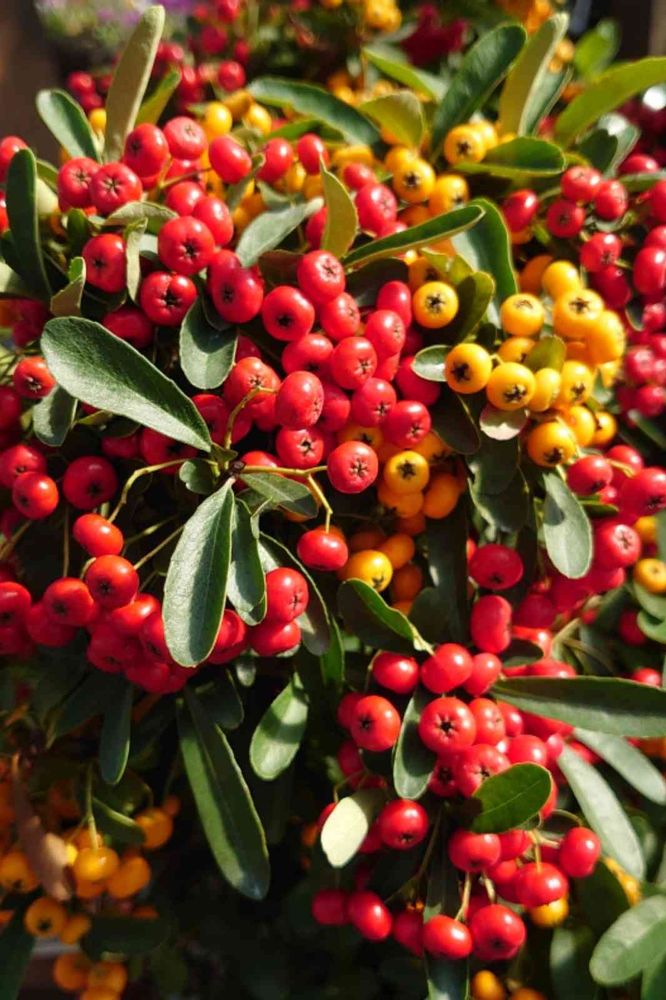 1つの木から赤と黄色のつぶつぶが出ているピラカンサ🔴🟡