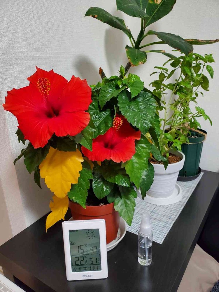寒くなってきたので部屋の中に入れた植木😊ハイビスカスは相変わらず咲きっぱなし😁