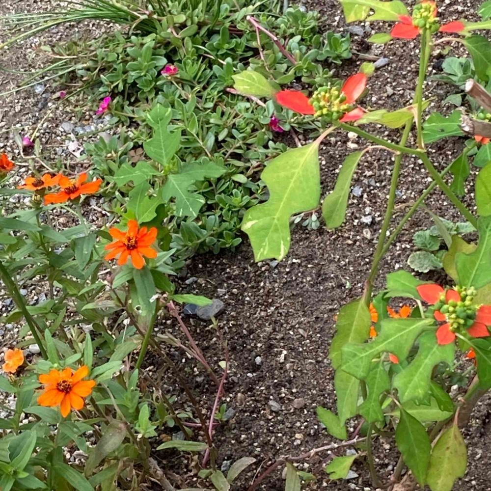 オレンジ色のジニアと猩猩草(サマーポインセチア)です。