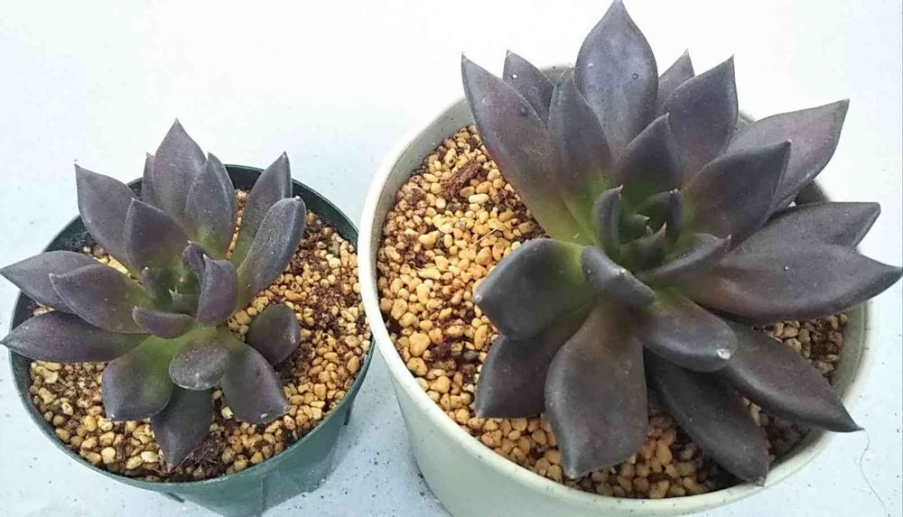 多肉マルシェで狩り、本日株分けして植替えしました。植え替え前は、左のスリット鉢に2つとも植わっていたのが嘘のようです。