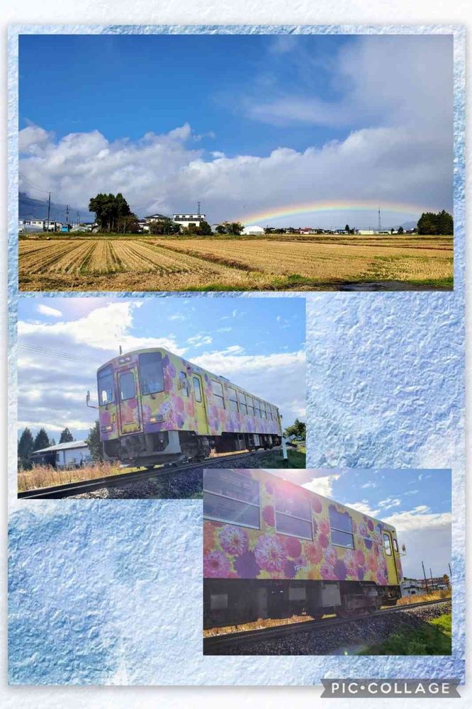 稲刈りを終えた田んぼにまたまた虹🌈がこの週は、ほぼ毎日のように🌈を数回見かけるというレインボー🌈ウィークでした。フラワー長井線🚃のダリア🏵️のラッピングがすごく綺麗でした😆