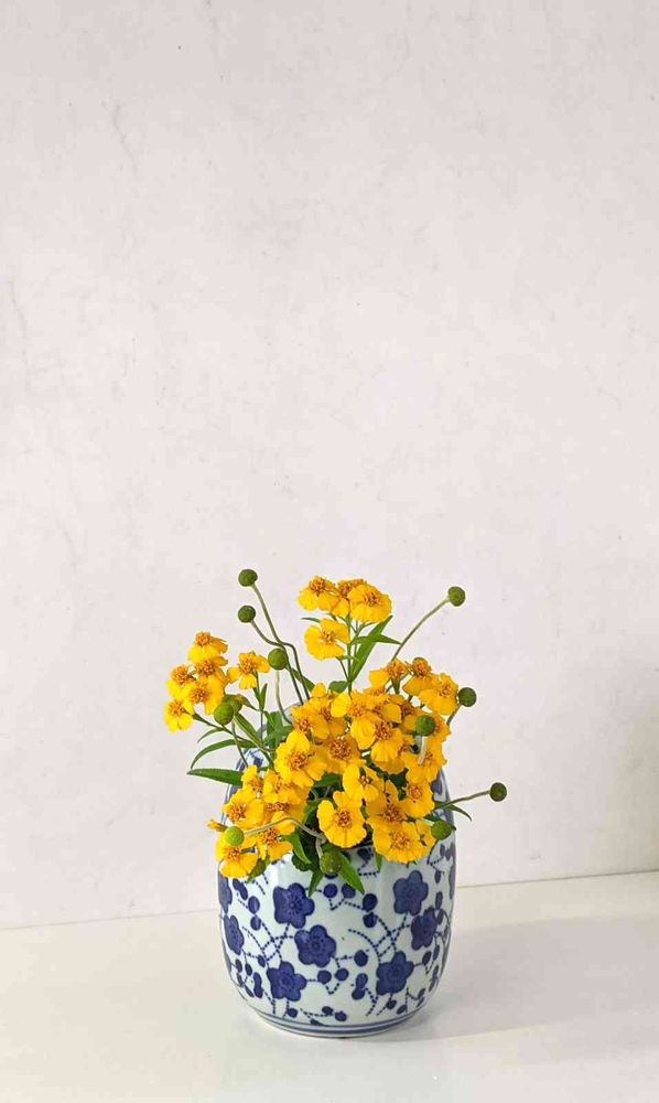 見頃をむかえたミントマリーゴールドとシュウメイギクの花びらが落ちた後の丸いポンポンが可愛いので一緒に生けてみました💛🟢💛🟢💛