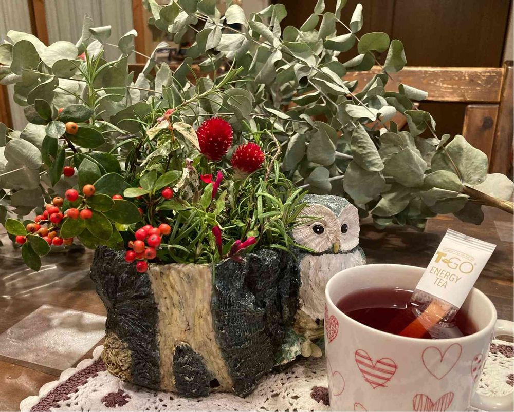 ドライユーカリとローズマリー、そして緑と赤の森の中のフクロウさん🦉🌿