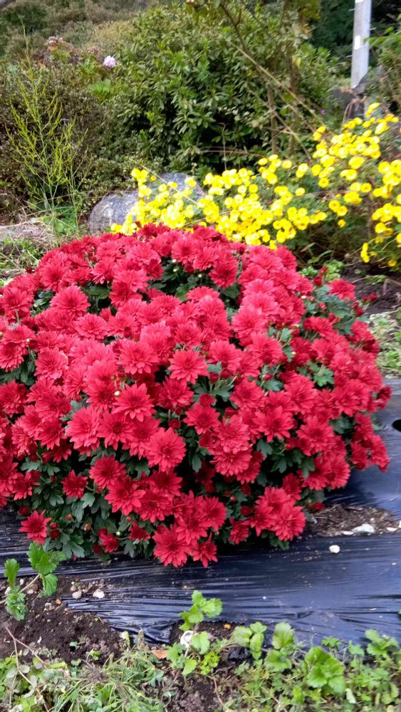 丸い赤い菊の花と黄色い小菊が咲いてました。
