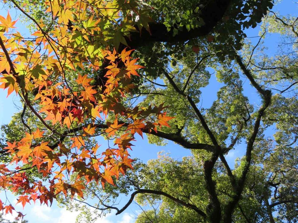 モミジの紅葉が始まり、楠の緑や青空とマッチして綺麗でした。