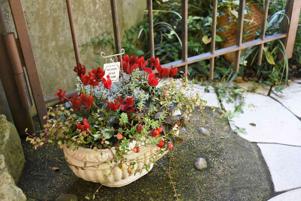 ワイヤープランツは2つに株分けし、中央にまとまったシクラメン は、外に向けるとナチュラルな雰囲気になります。
