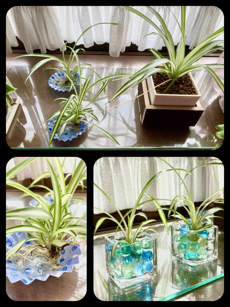 7月に80円で買ったオリヅルラン🪴出窓で元気に成長中!ランナーの子株をお弁当のおかずカップ(笑)で受けてたら根も出てきて、100均で見つけた、ビーズみたいなやつにランナーから切り取って飾ってみたよ…これでもちゃんと育つのかな?