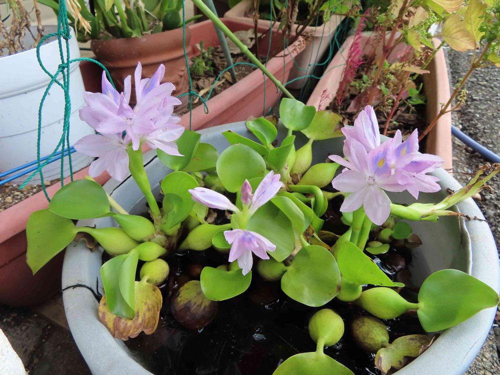 気温が下がってきた10月下旬、「ホテイアオイ」が花を咲かせていました。 パチリ