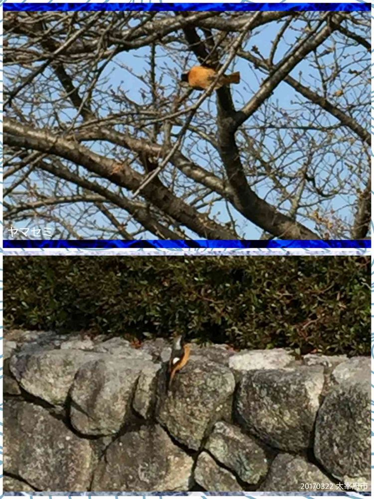 場所は、太宰府市の御笠川の遊歩道(上の桜の木)と、そのそばの図書館(下の石垣)です。