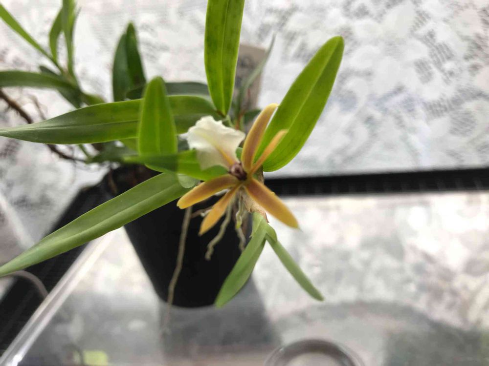 小型蘭、ディネマ・ポリブルボンが咲いた。去年の蘭展で買ってきた蘭。