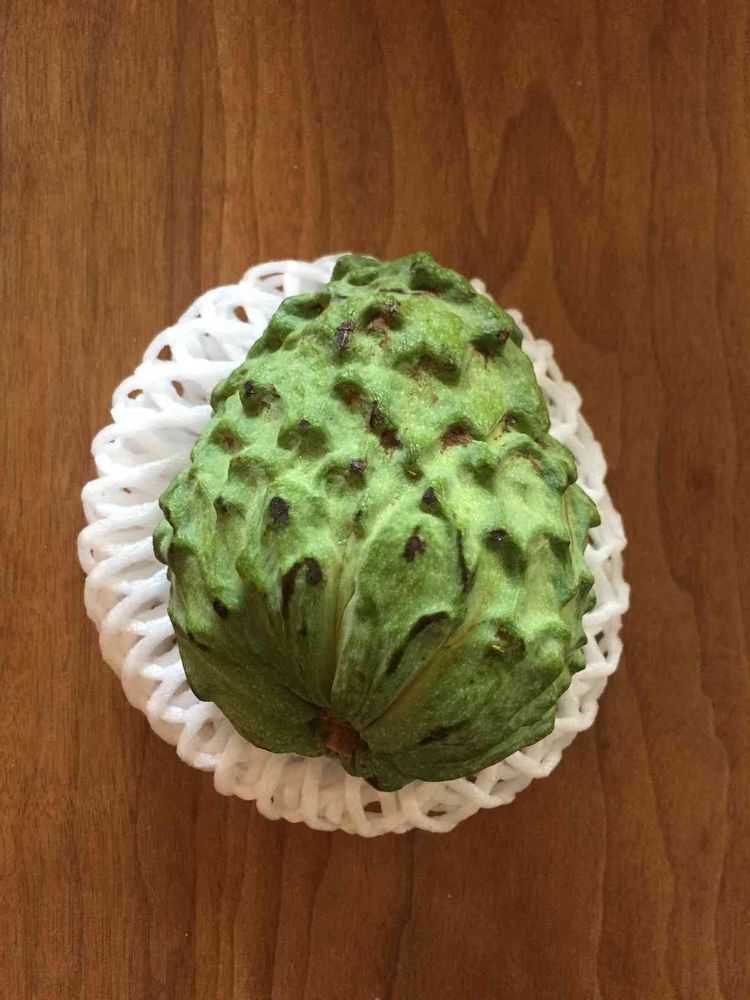 シンガポールの同僚曰く「森のミルク」とのことで調べてみたら、アテモヤという名前のようです。別名シュガーアップルだそうで、甘いリンゴのような味なのかなぁ。