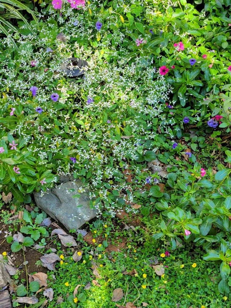 放置している間にレンガの道は埋もれてます😅 ますますユーフォルビアダイヤモンドフロストが繁茂し、スーパートレニアの青のちらちらが増えました 刈り込みしてないので何もかもが徒長はしてると思いますが、ナチュラルな感じではあります😁